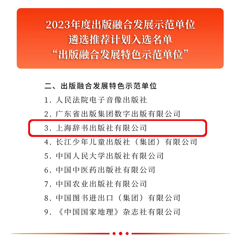 近日,国家新闻出版署公布2023年度出版融合发展工程入选名单,上海辞书出版社入选“出版融合发展特色示范单位”。这是上海辞书出版社连续第二次入选国家新闻出版署出版融合发展工程。